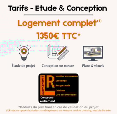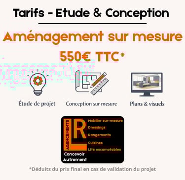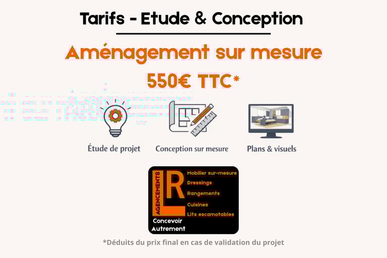 Les frais d’étude et de conception comprennent notamment : l’analyse des besoins, les échanges préparatoires, les relevés de cotes, la conception sur mesure, ainsi que la réalisation de plans et/ou visuels 3D.